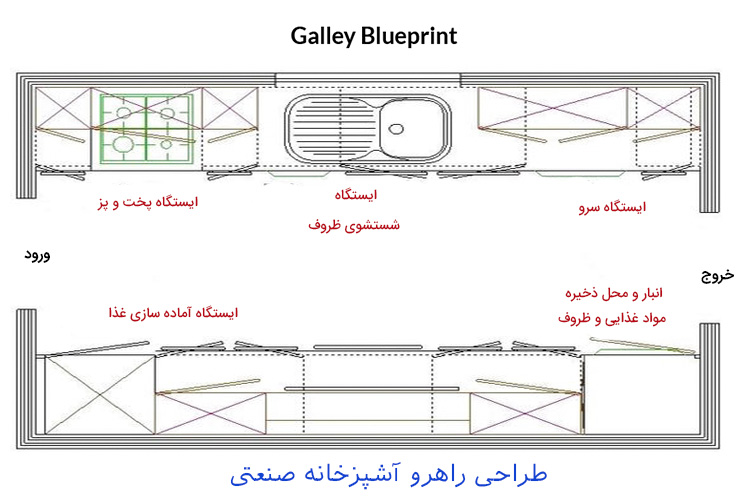 طرح Galley یک طرح باریک است که در آن ایستگاه ها و تجهیزات در امتداد دو دیوار موازی قرار گرفته اند و فضایی را برای یک راهروی مرکزی ایجاد می کنند. گاهی اوقات به دلیل راهروی باریکی که خط اصلی ترافیک آن را تشکیل می دهد، آشپزخانه راهرو نیز نامیده می شود.چیدمان Galley ایستگاه های مختلف آشپزخانه شما را در سراسر محیط اتاق پخش می کند نه در مرکز. این برای آشپزخانههایی با فضاهای محدود مناسب است، زیرا بیشتر تجهیزات سنگین در کنار یک یا دو دیوار بلند آشپزخانه قرار میگیرند و فضای کافی برای پرسنل شما ایجاد میکند تا به راحتی و بدون اینکه در مسیر یکدیگر قرار بگیرند، حرکت کنند. ورودی و خروجی آشپزخانه معمولاً در مقابل محل قرارگیری وسایل مورد استفاده برای تهیه غذای شما قرار دارد.