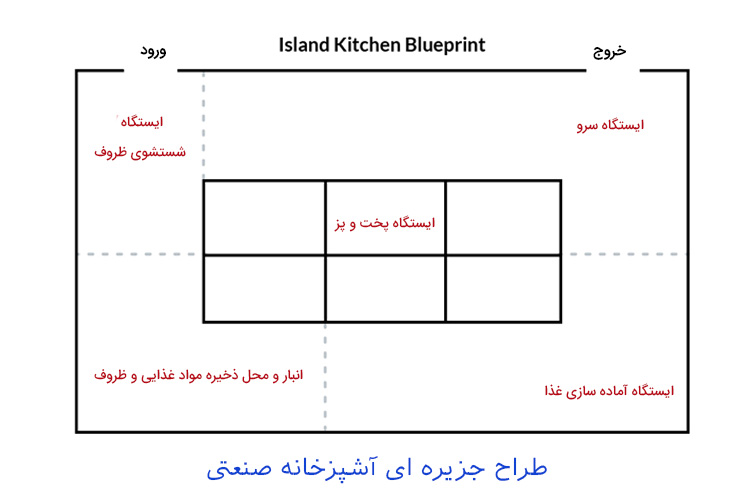 طراحی آشپزخانه صنعتی جزیره با طرح حلقه شروع می شود و یک ایستگاه آماده سازی یا پخت مرکزی اضافه می کند. به عنوان مثال ، یک آشپزخانه ممکن است دارای واحدهای ذخیره سازی، ایستگاه های شستشو و پیشخوان های آماده سازی غذا در اطراف آن و وسایل پخت و پز در مرکز آن باشد.